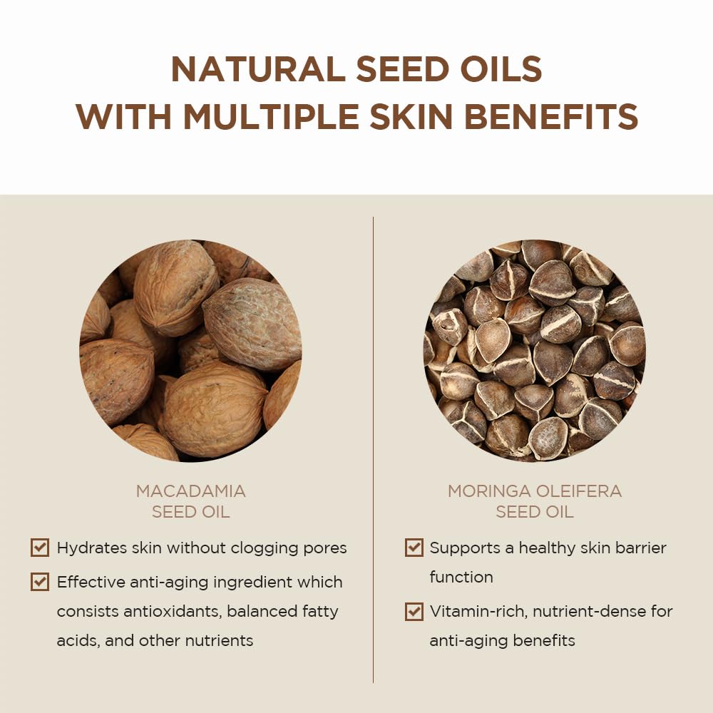 Enriched with skin-friendly seed oils, the formula enhances absorption of its nourishing essence, effectively soothing and hydrating dry skin.