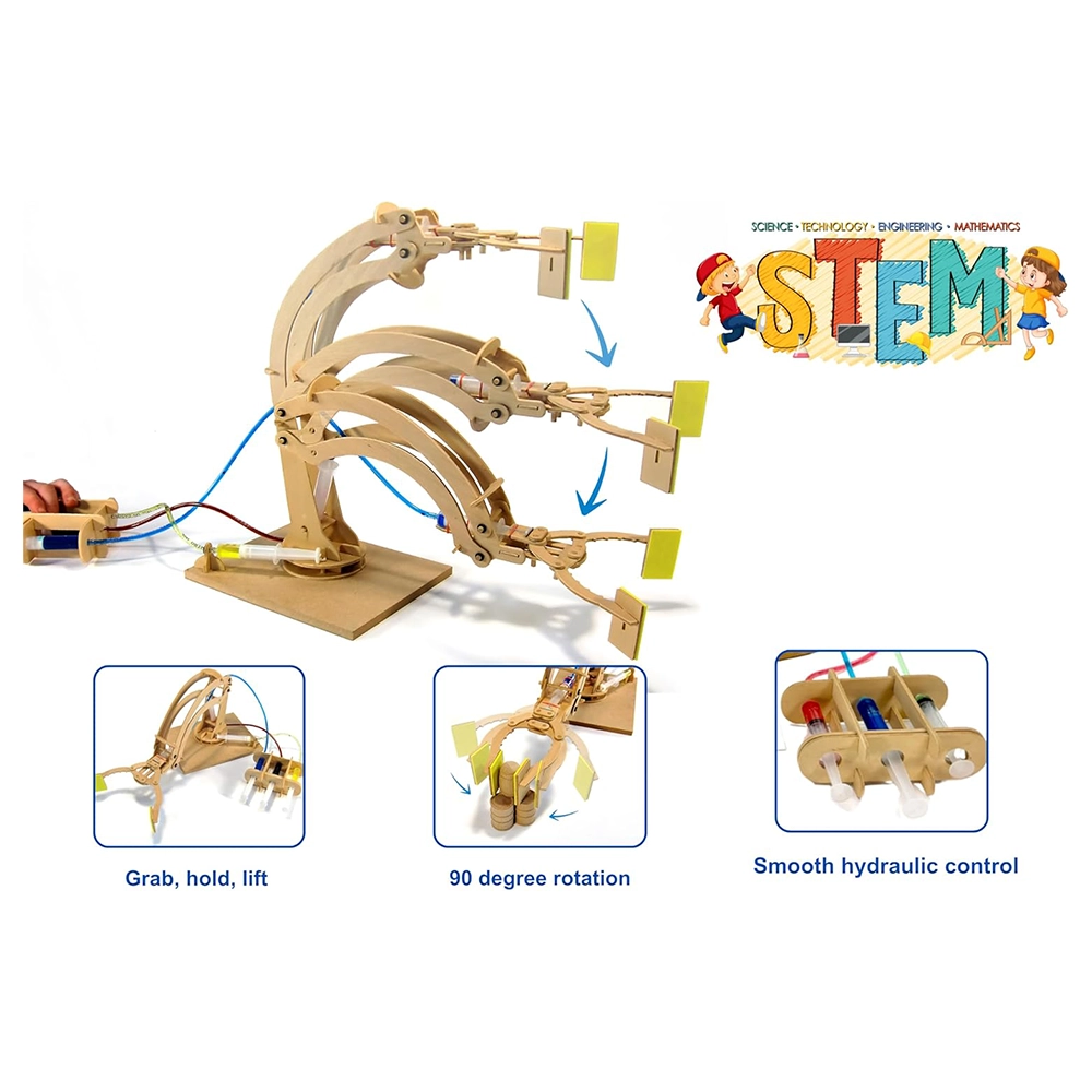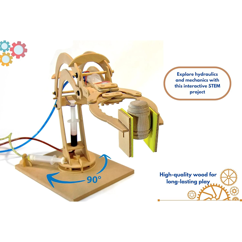Build your own hydraulic robotic arm with this complete DIY wooden construction kit. Designed to demonstrate mechanical engineering and fluid dynamics, this hands-on STEM toy allows kids to explore real-world science while having fun. Once built, the arm can lift objects, rotate up to 90 degrees, and perform basic manipulations – ideal for both learning and play!
